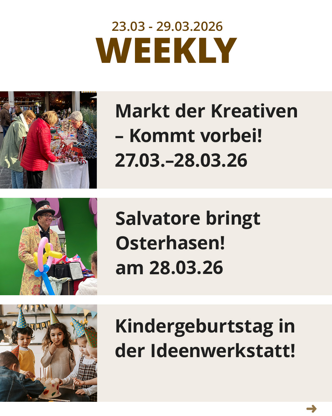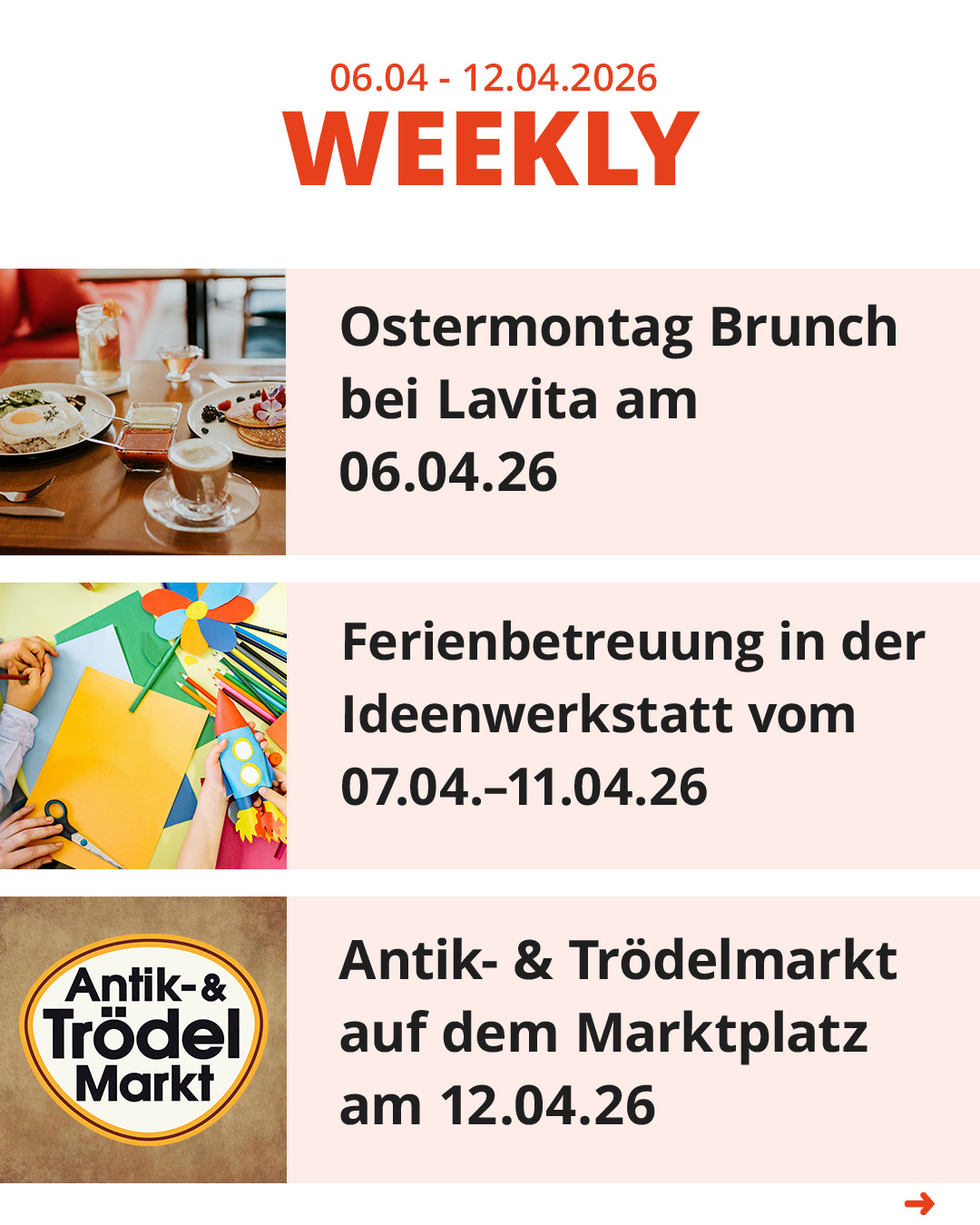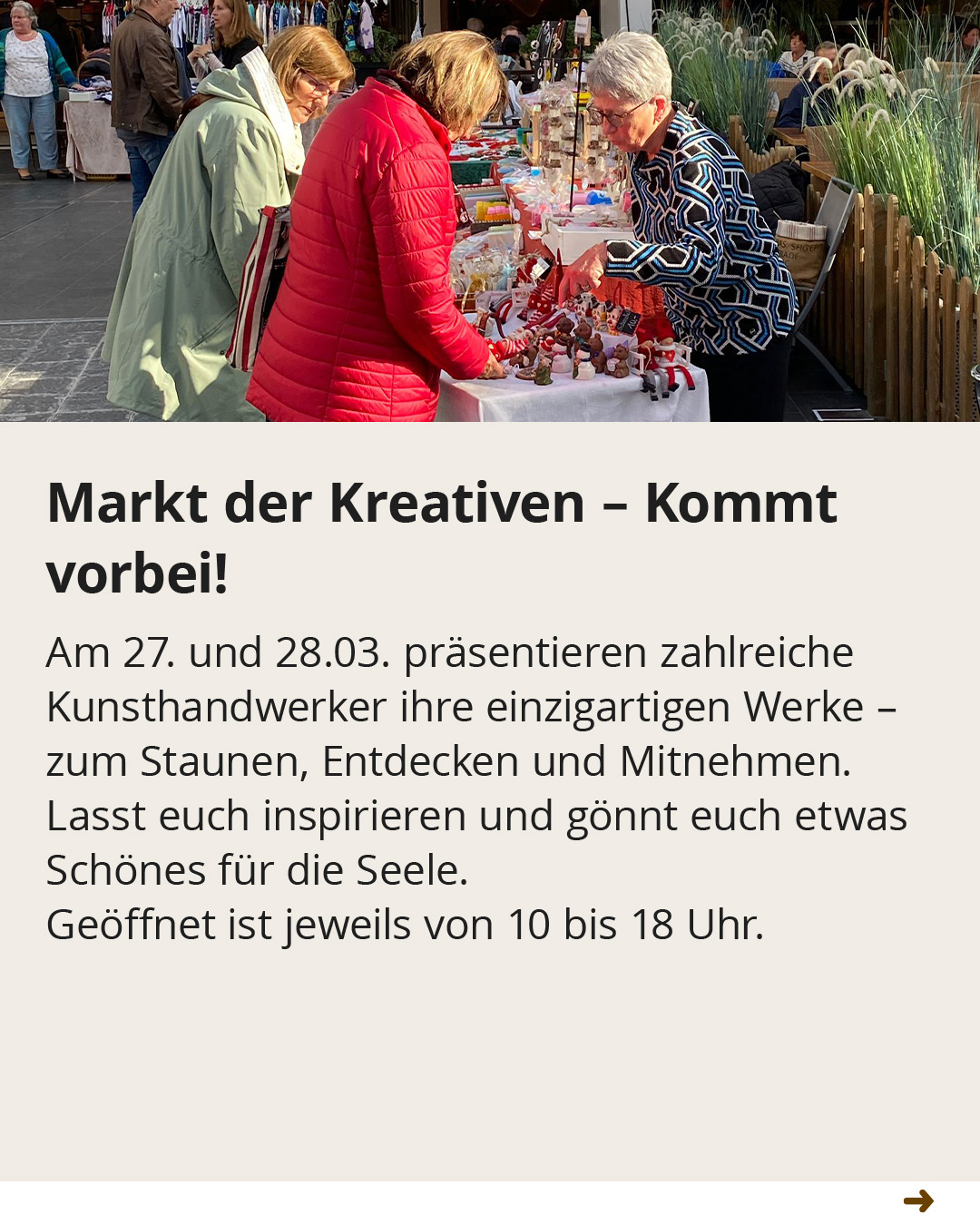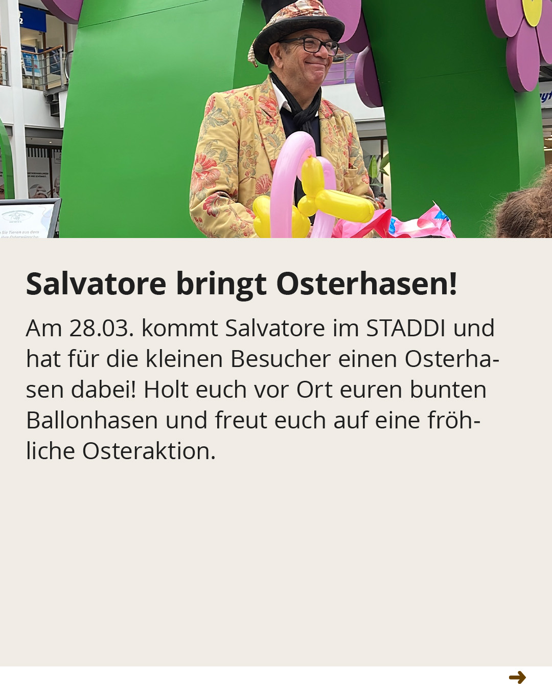 Endlich wird es Frühling! Wir haben das STADDI für Sie fein gemacht: Genießen Sie unsere wunderschöne Osterdeko auf dem Marktplatz und lassen Sie sich vom bunten Treiben verzaubern. Ob zum entspannten Ostershopping, zum gemütlichen Brunch mit der Familie oder auf einen Kaffee mit Freunden – bei uns finden Sie die perfekte Auszeit vom Alltag.