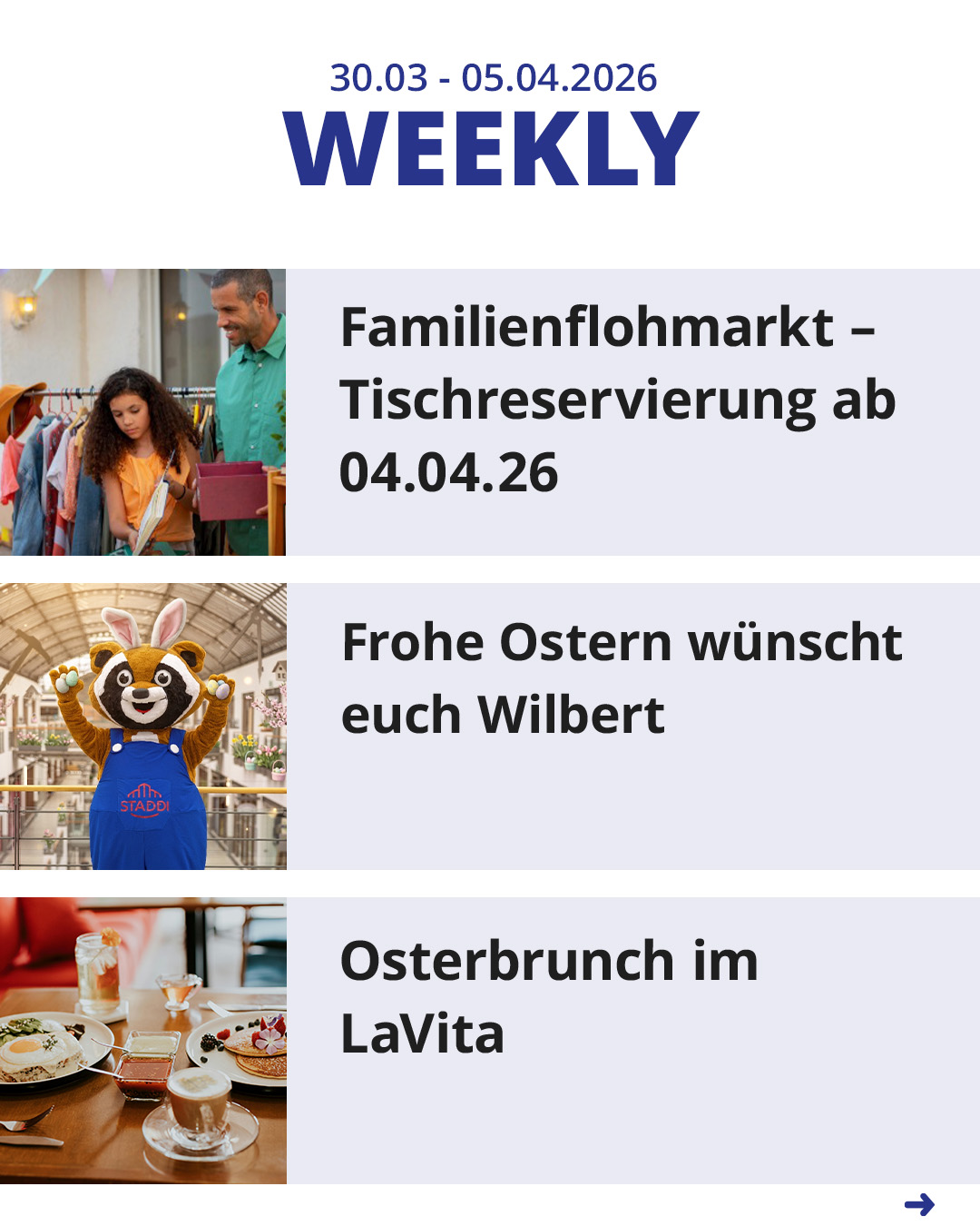 Endlich wird es Frühling! Wir haben das STADDI für Sie fein gemacht: Genießen Sie unsere wunderschöne Osterdeko auf dem Marktplatz und lassen Sie sich vom bunten Treiben verzaubern. Ob zum entspannten Ostershopping, zum gemütlichen Brunch mit der Familie oder auf einen Kaffee mit Freunden – bei uns finden Sie die perfekte Auszeit vom Alltag.